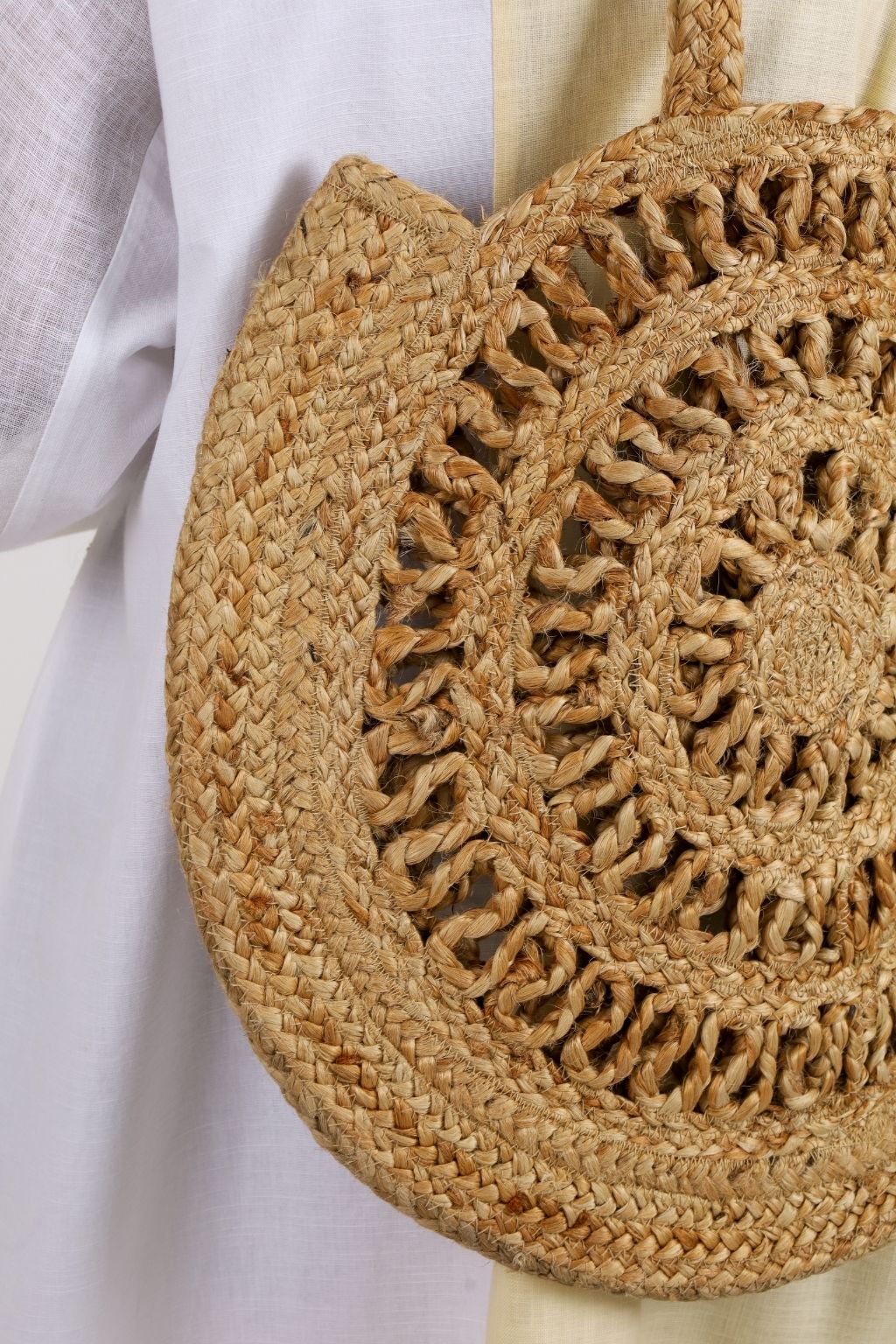 - Beach-Ready Companion: The Jute Round Bag is not only fashionable but also practical for beach adventures. Its spacious interior allows you to pack your beach essentials such as sunscreen, towel, sunglasses, and more. The natural jute material is also resistant to sand and easy to clean, making it a reliable companion for your beach trips.